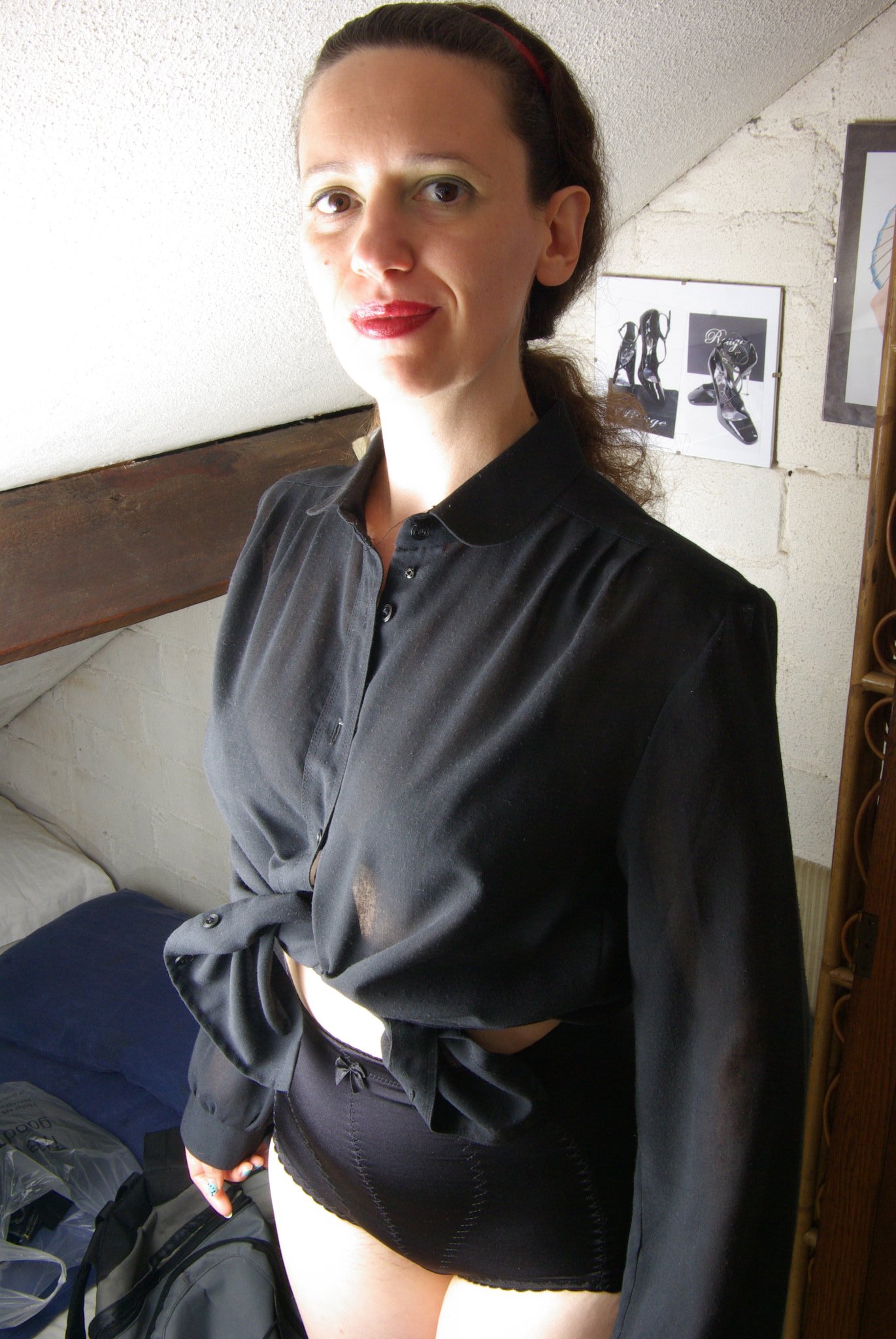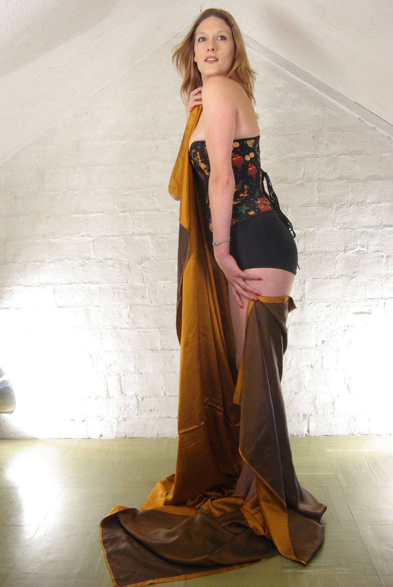 This is the second of a series of photo shoots, intended to document Sarah’s progress as she gets back into shape after given birth to two healthy babies. First part of the shoot was with Sarah on her own, modelling her own tightly-laced corset, teamed up with a pair of snugly fitting black lycra control briefs, worn as gym-shorts.
