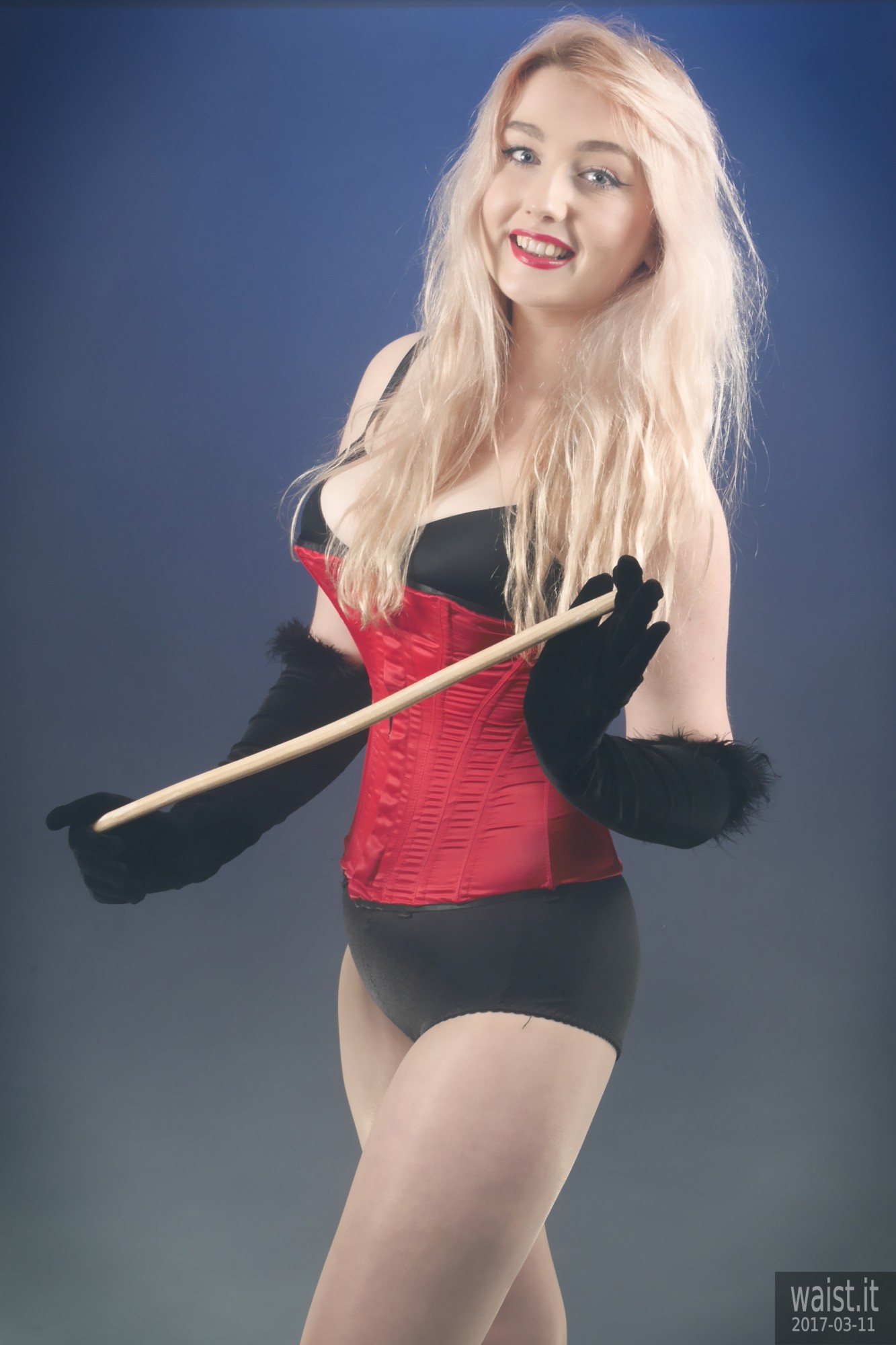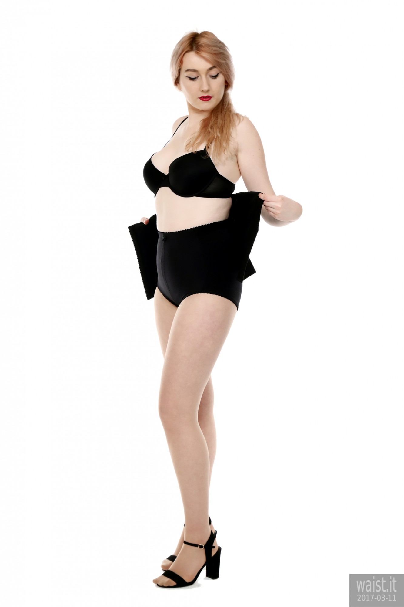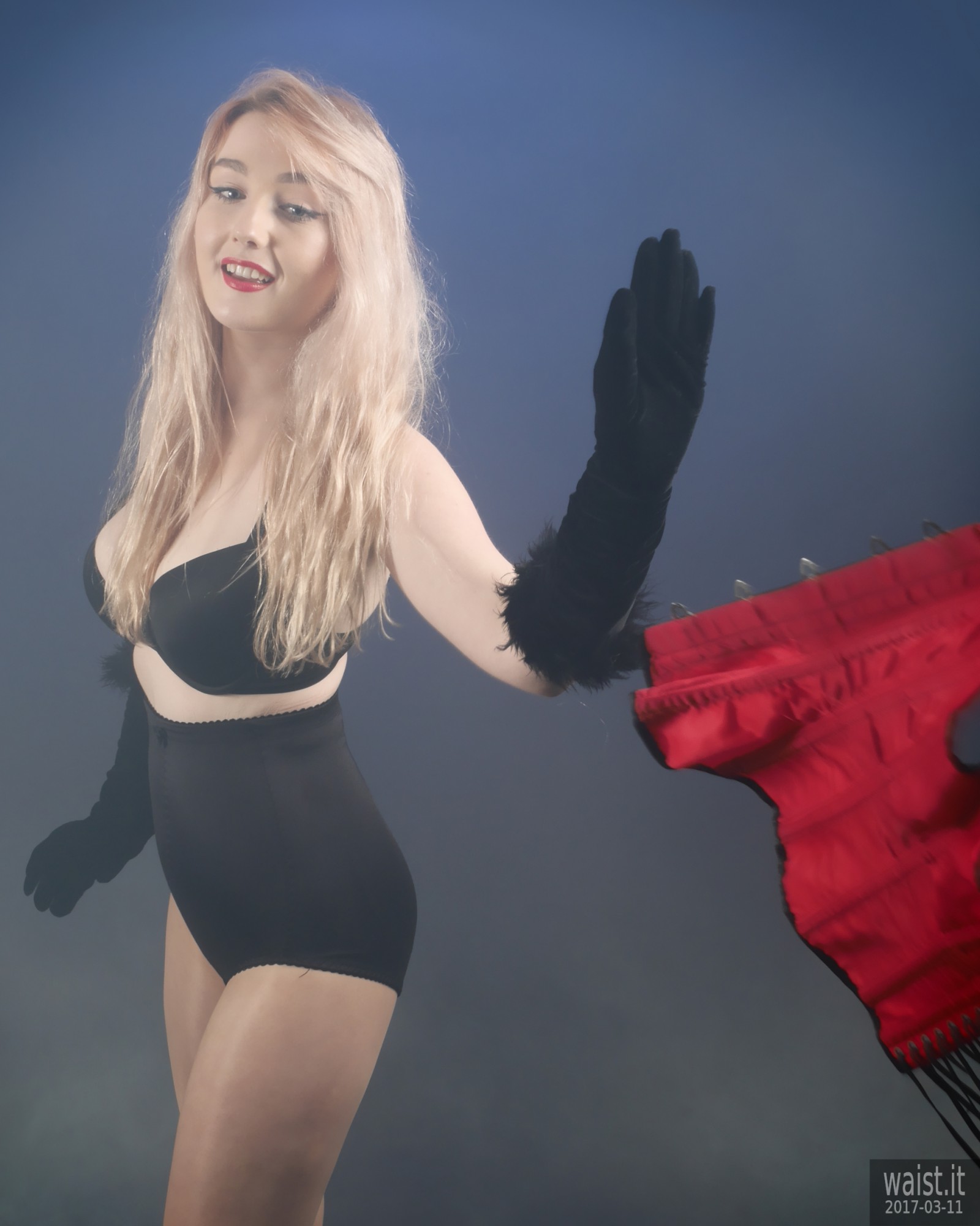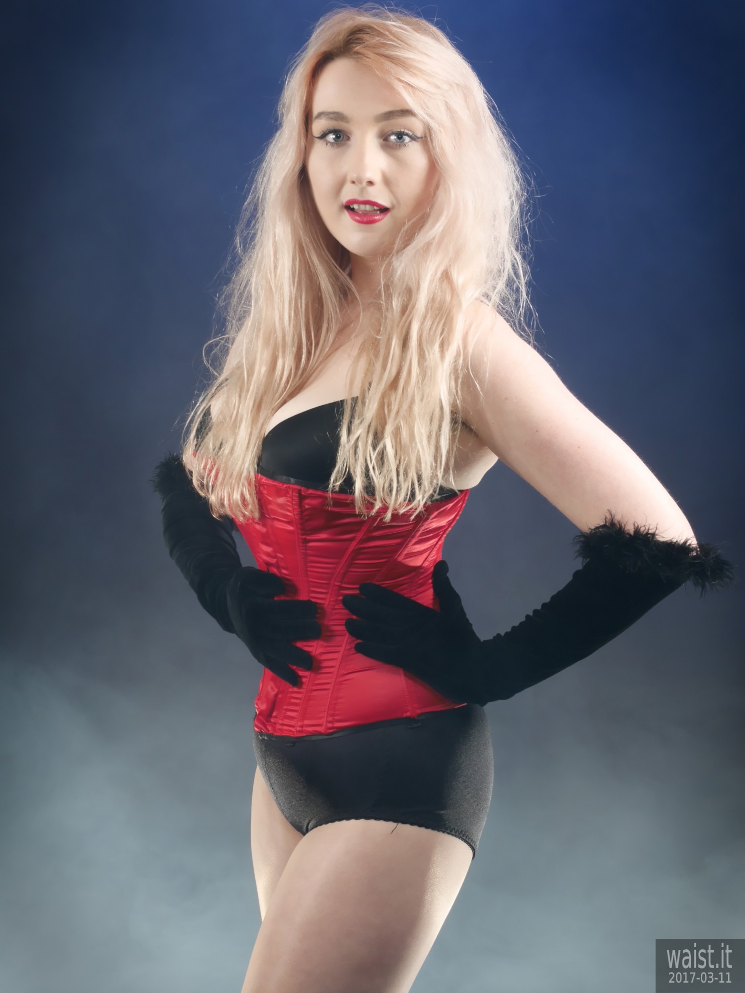 We did four separate sets and quite a few costume changes. She tried a variety of corsetry, ranging from 60’s style pantie-girdles worn as hot pants, through to a genuine Vollers overbust lace-up corset. She also brought her own waist-trainer. We had a lot of fun with that – filming her as she wriggled into it. However, as is often the case with really good shoots, our six hours together whizzed past in what seemed like about twenty minutes. Which meant the clock prevented us from trying all the available costumes. However, Lily does not live far from here. So hopefully we will be able to persuade her to come back for a rematch, in the not-too-distant future. 🙂