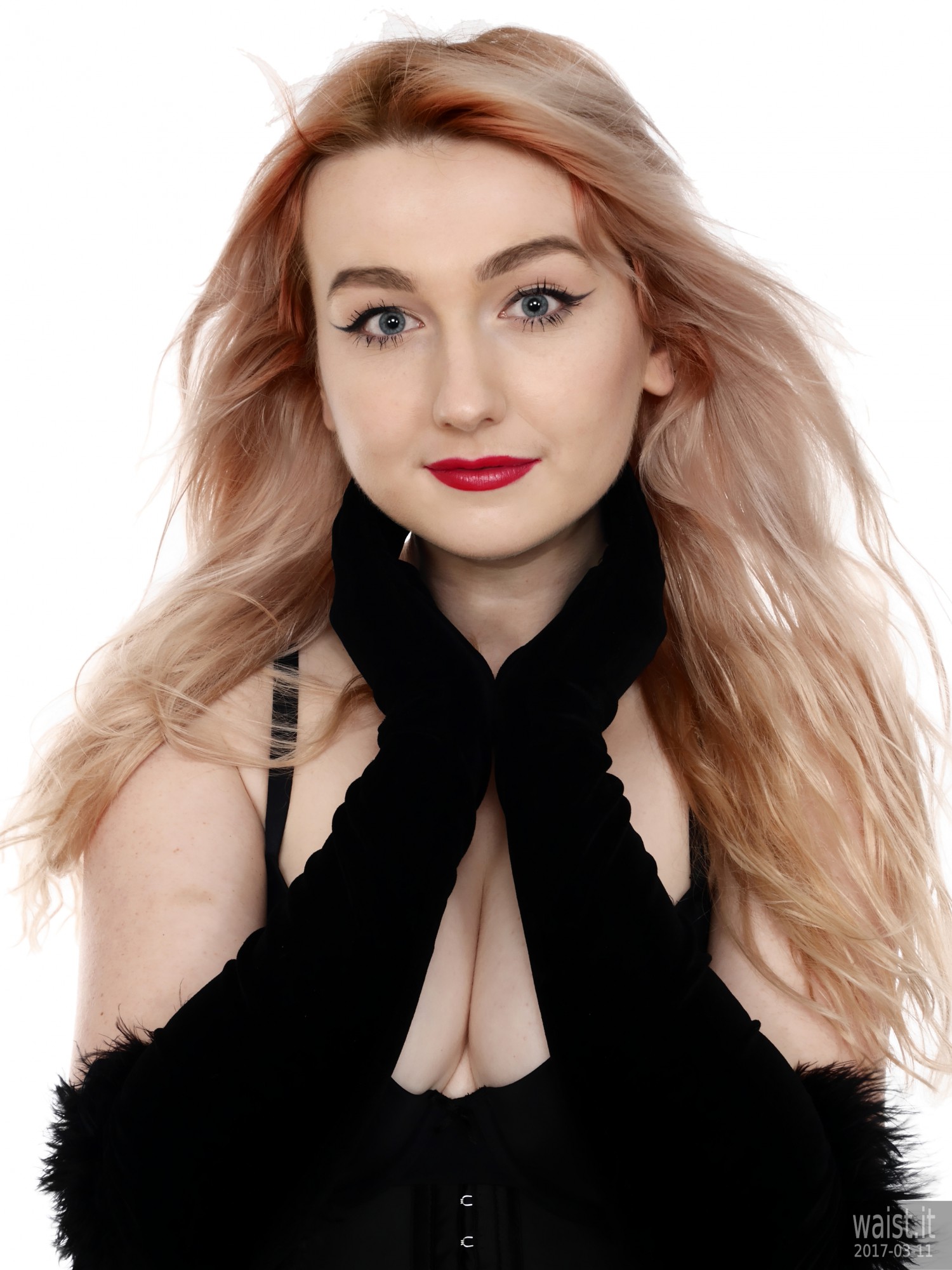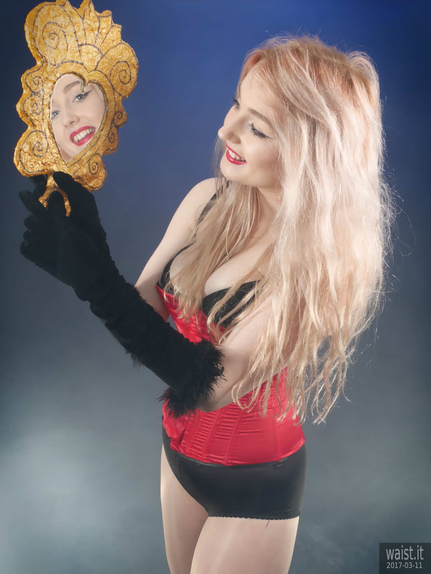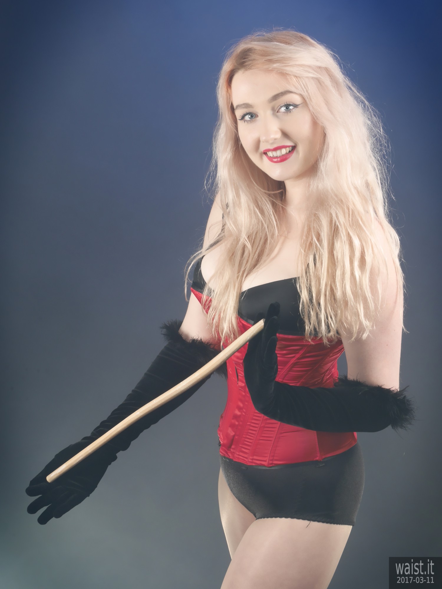 We did four separate sets and quite a few costume changes. She tried a variety of corsetry, ranging from 60’s style pantie-girdles worn as hot pants, through to a genuine Vollers overbust lace-up corset. She also brought her own waist-trainer. We had a lot of fun with that – filming her as she wriggled into it. However, as is often the case with really good shoots, our six hours together whizzed past in what seemed like about twenty minutes. Which meant the clock prevented us from trying all the available costumes. However, Lily does not live far from here. So hopefully we will be able to persuade her to come back for a rematch, in the not-too-distant future. 🙂